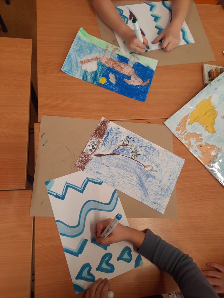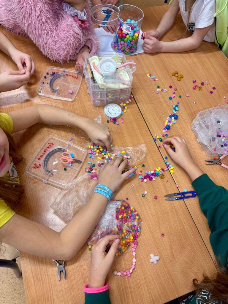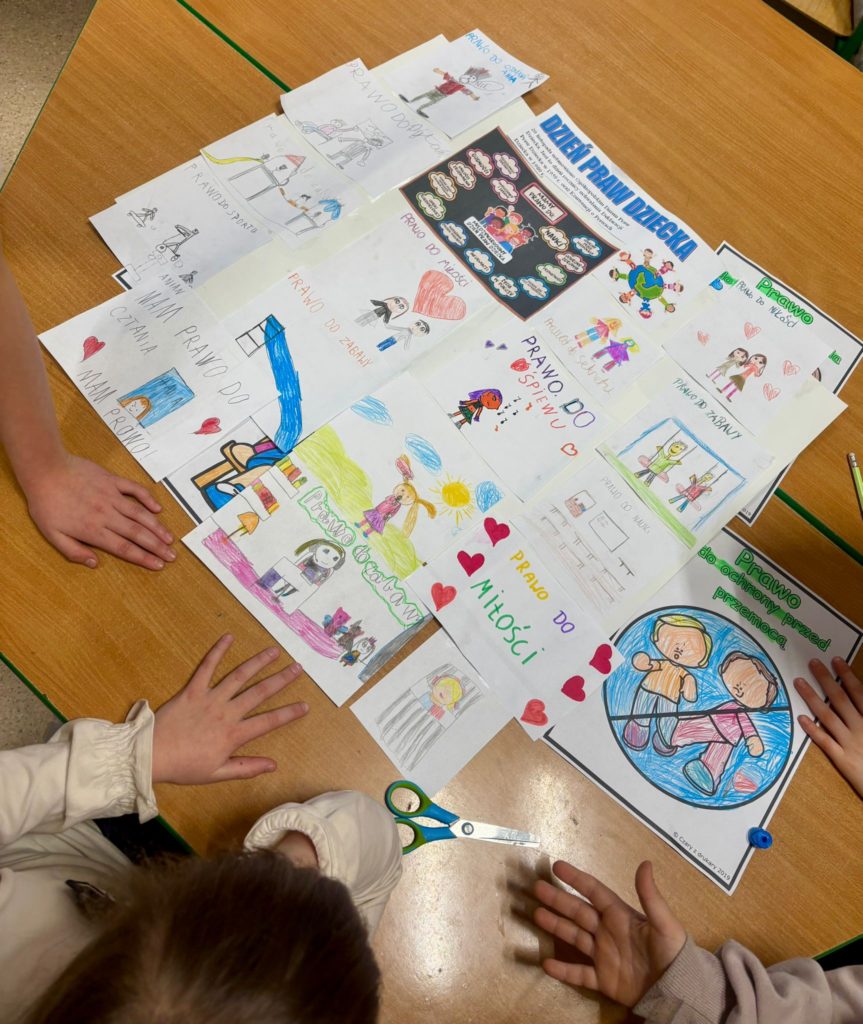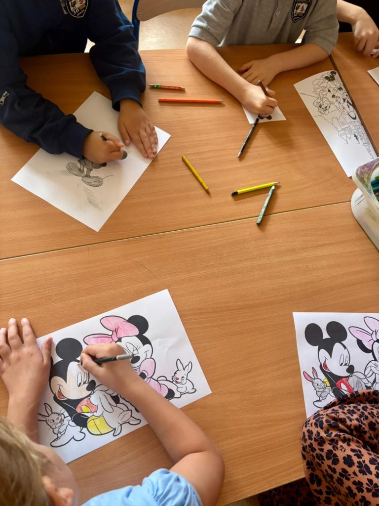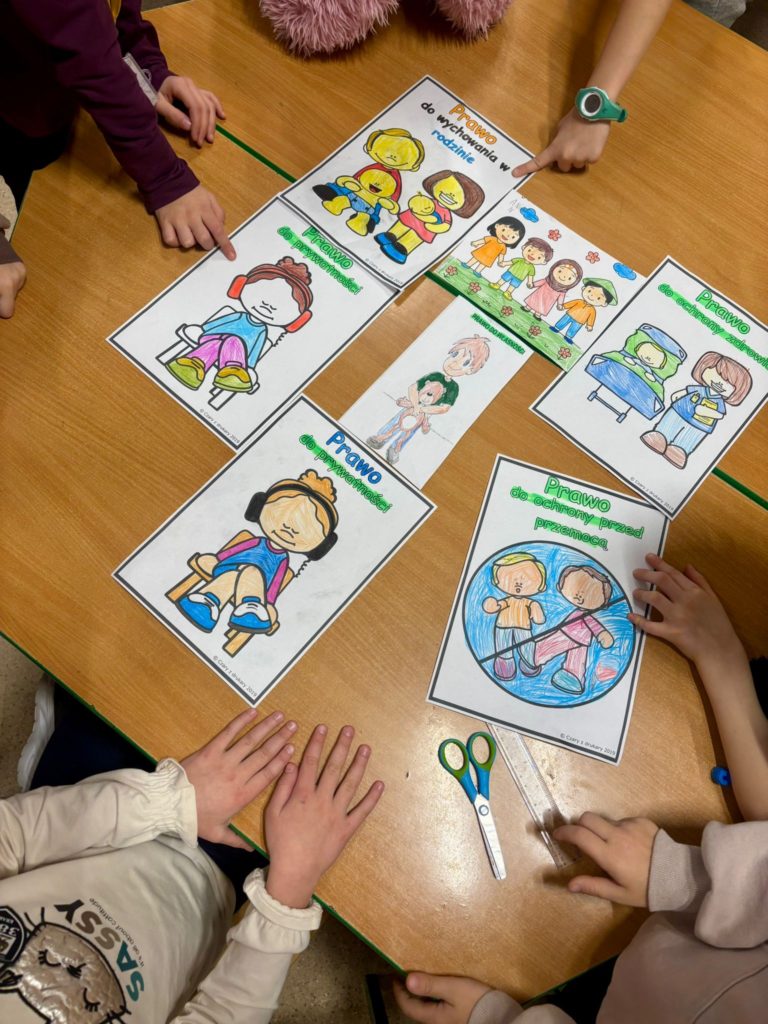Z okazji Dnia Praw Dziecka obejrzeliśmy film edukacyjny, uczestniczyliśmy w pogadance, wysłuchaliśmy wiersza i zaśpiewaliśmy piosenki. Zrobiliśmy również kolorowanki tematyczne i stworzyliśmy plakat. W Dniu ciasta obejrzeliśmy film edukacyjny o pracy cukiernika i zajęliśmy się dekorowaniem papierowych ciast i babeczek. Dzieci brały udział w tworzeniu prac plastycznych z tektury, ozdabiały wzorzystym papierem i koralikami zegarki na rękę, bransoletki, a także telefony komórkowe i tablety. Świetliki budowały prace wg wzoru z klocków Jenga, ćwiczyły nawlekanie koralików, tworzyły papierowy domek dla żółwików, świętowały Dzień Myszki Mickey. Dzieci brały udział w zajęciach ruchowych i tanecznych. Dużym powodzeniem cieszyła się zabawa z krzesłami.