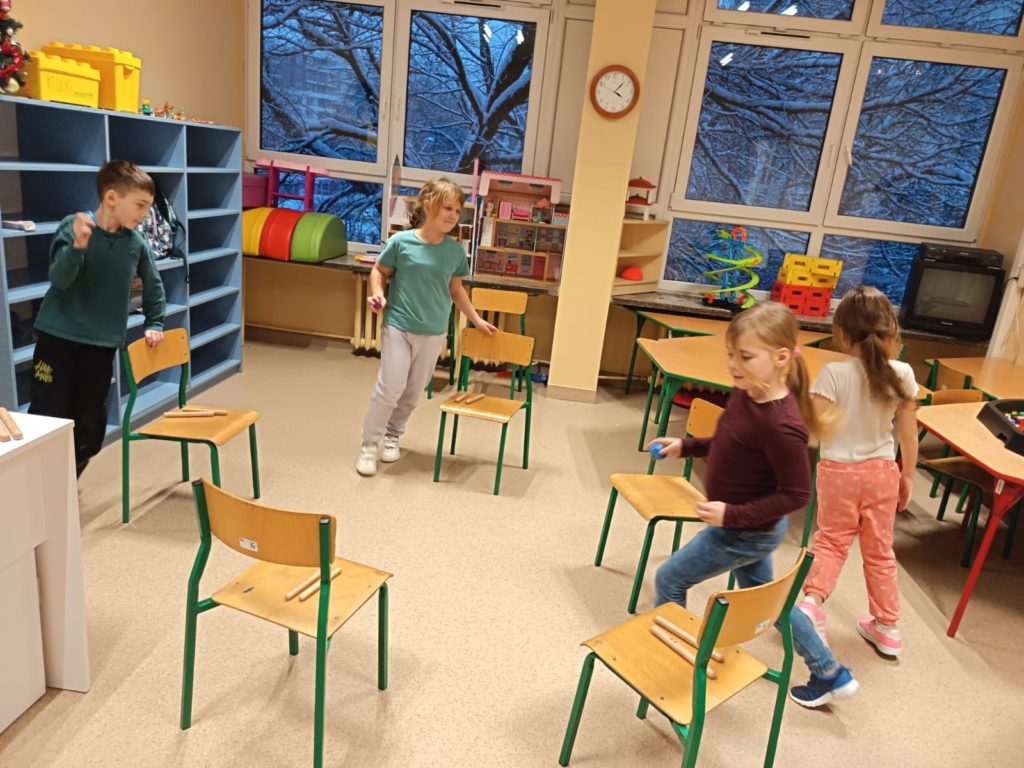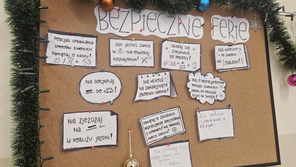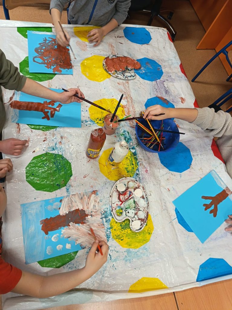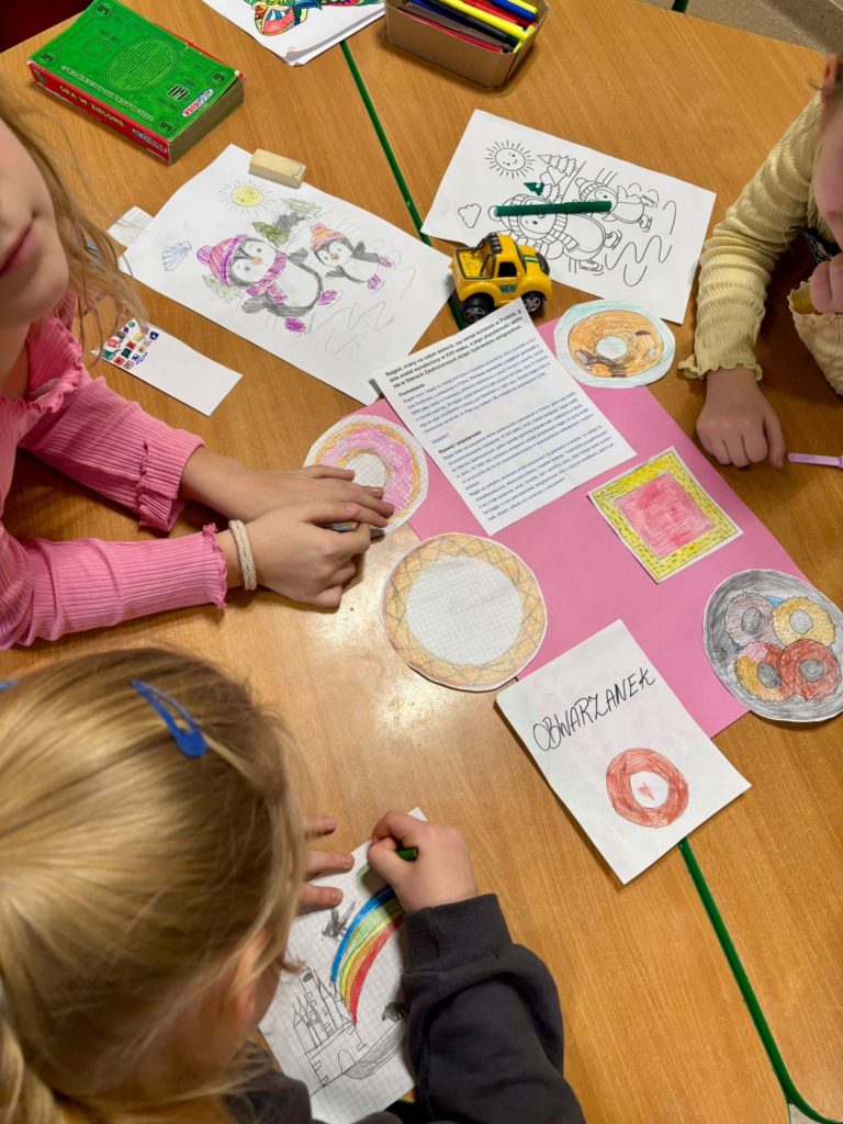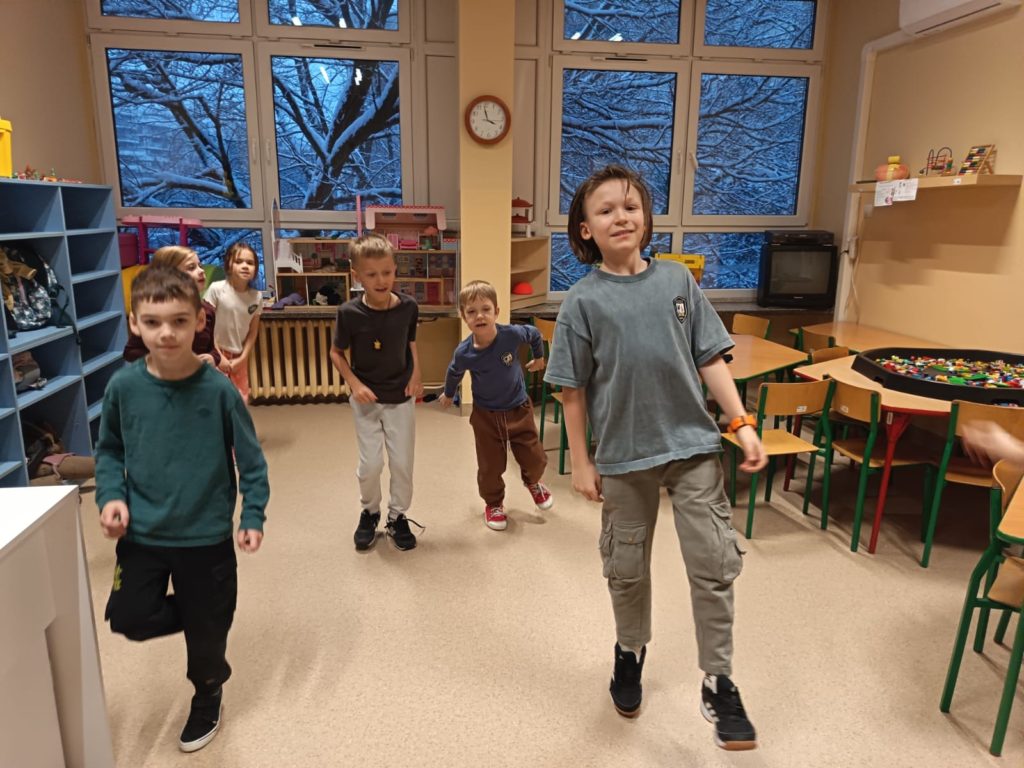 Na początku stycznia obchodziliśmy światowy Dzień Bajgla. Poznaliśmy historię bajgla i obwarzanka krakowskiego, a z filmu edukacyjnego dowiedzieliśmy się jakie są sposoby ich wypiekania. Stworzyliśmy plakat z ozdobionymi przez dzieci obwarzankami. Podobnie świętowaliśmy również Dzień Pizzy. Na zajęciach z przysłowiami polskimi dzieci dowiedziały się co znaczy „Idzie luty podkuj buty”. Rozmawialiśmy o bezpieczeństwie podczas zimowych zabaw i stworzyliśmy kodeks bezpiecznych zachowań podczas ferii. Tworzyliśmy bransoletki z muliny. Malowaliśmy zimowe drzewa. Tworzyliśmy prace długopisami 3D o różnej tematyce i uzyskując ciekawe efekty, dzięki łączeniu z innymi materiałami, jak sznurek czy papier. Świetliki uczestniczyły w zajęciach z rytmiki, karaoke, mat tanecznych. Bawiły się w tematycznych kącikach zabaw, grały w gry planszowe, konstruowały twórczo z różnego rodzaju klocków.